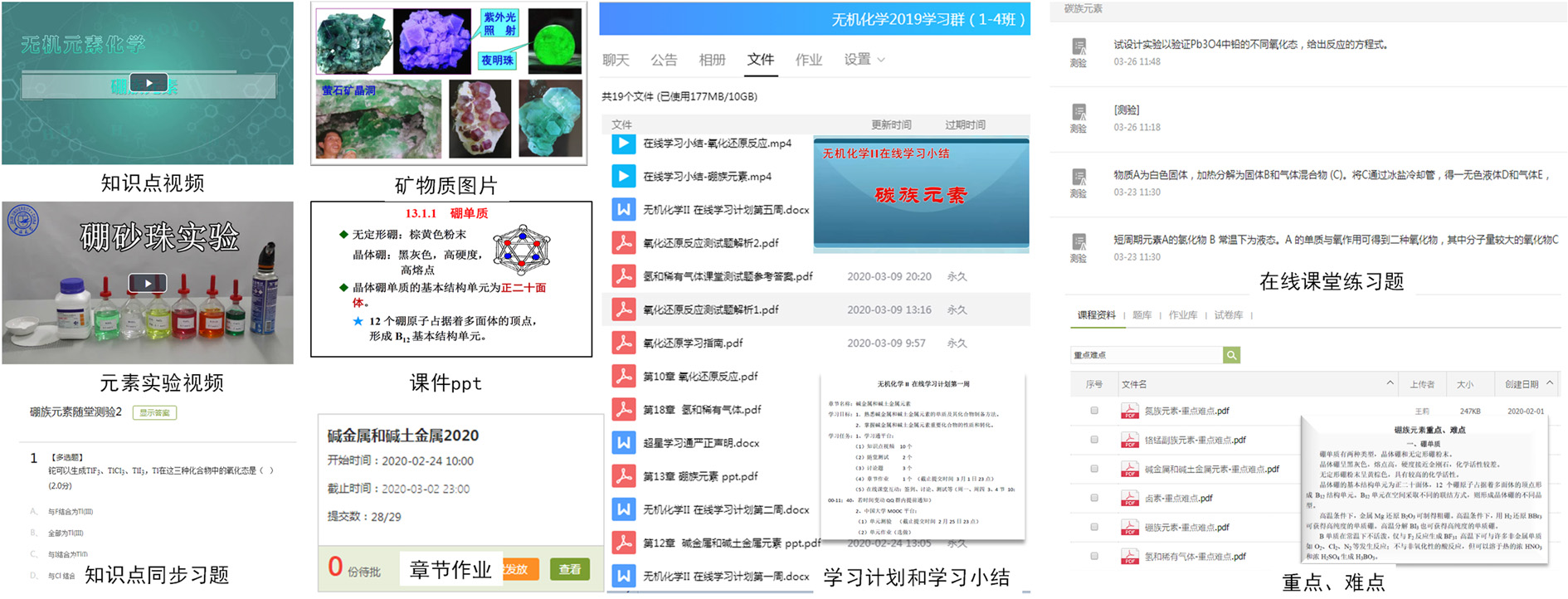 “无机化学II”课程的授课对象是化学专业的大一学生,他们正处于向自主式学习转变的过渡时期,自我管理能力不强、学习意志较为薄弱。如何引导、调动学生的学习积极性,是我们在线教学课程设计的重点。我们以吉林大学、武汉大学、山东大学、北京化工大学和中国海洋大学五校共建的“无机元素化学”MOOC为主要教学方式,以学习通为载体完成在线课堂互动,并依据学习通的大数据对学生各环节的学习情况进行跟踪和分析,不断调整具体的教学内容,同时以学习通和QQ群进行师生互动交流,以有效完成教与学。