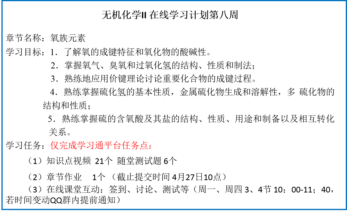 图1 无机化学II在线教学周学习计划和学习指南示例