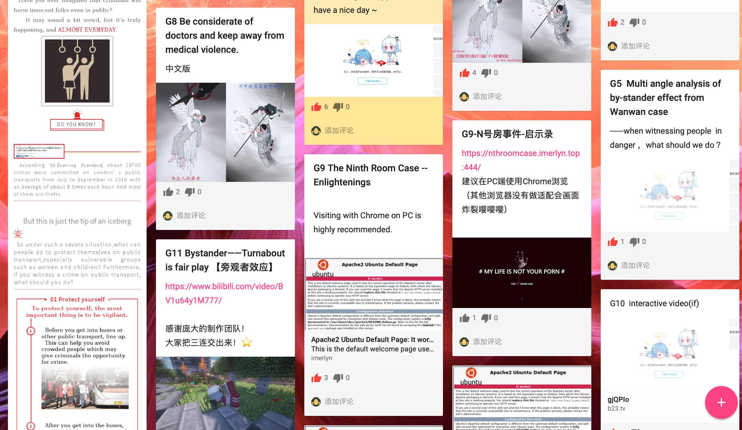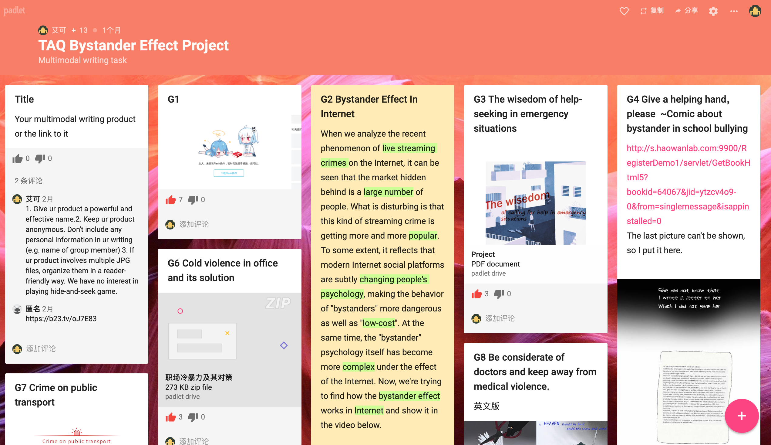 本章展示了全班同学“Bystander Effect”(BE)项目多模态写作作品。同学们的选题包括了校园霸凌、弯弯酒店遇袭、韩国N号房等;形式涵盖了互动视频,网站网页,漫画海报。为了帮助到更多的人,每组还制作了中英两版,或采用中英文字幕。