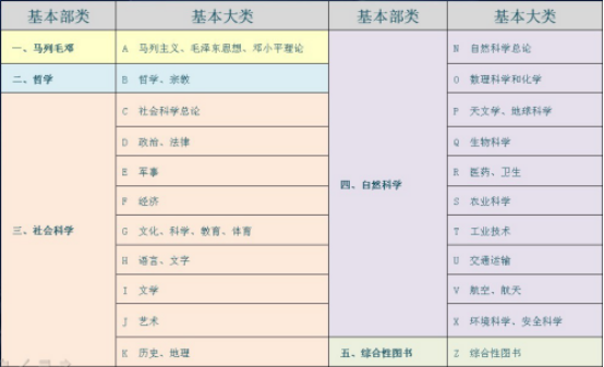 《中图法》是《中国图书馆分类法》的简称,是我国目前通用的类分图书的工具。根据图书资料的特点,按照从总到分,从一般到具体的编制原则,确定分类体系,在五个基本部类的基础上,组成二十二个大类。《中图法》的标记符号采用汉语拼音字母与阿拉伯数字相结合的混合号码。即用一个字母表示一个大类,以字母的顺序反映大类的序列。字母后用数字表示大类以下类目的划分。数字的编号使用小数制。现将五个基本部类及下设的二十二个大类列表如下: