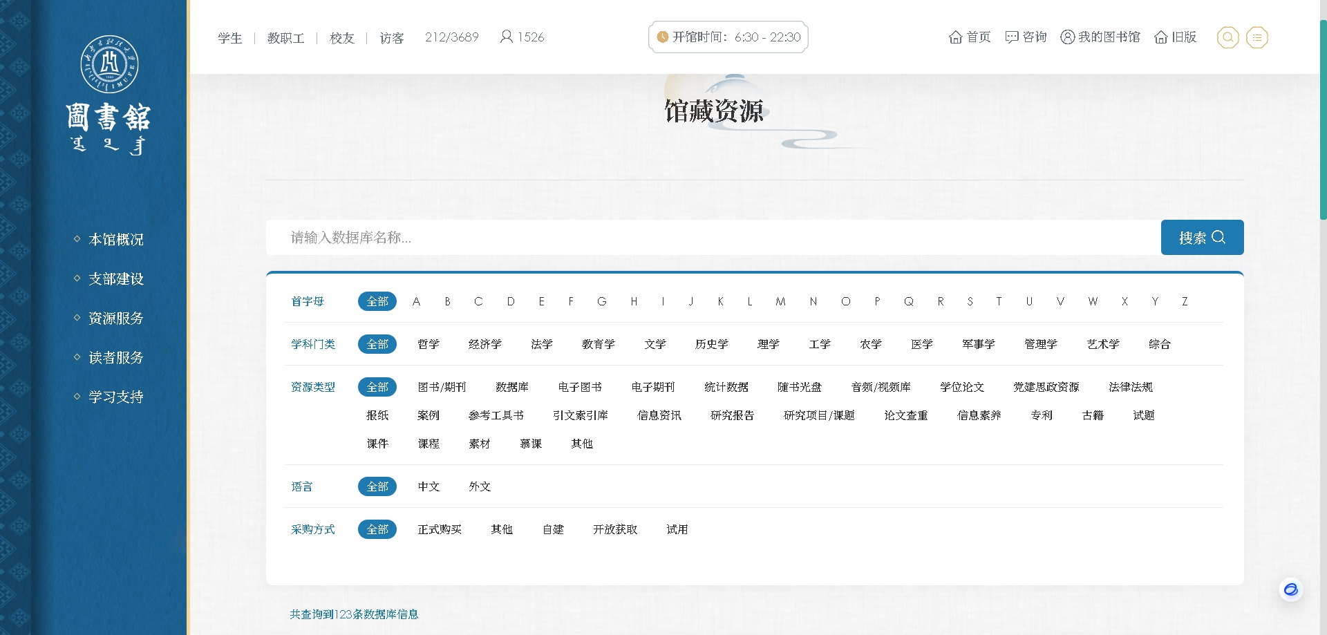 6、点击“图书数据库”进入图书馆数据库界面