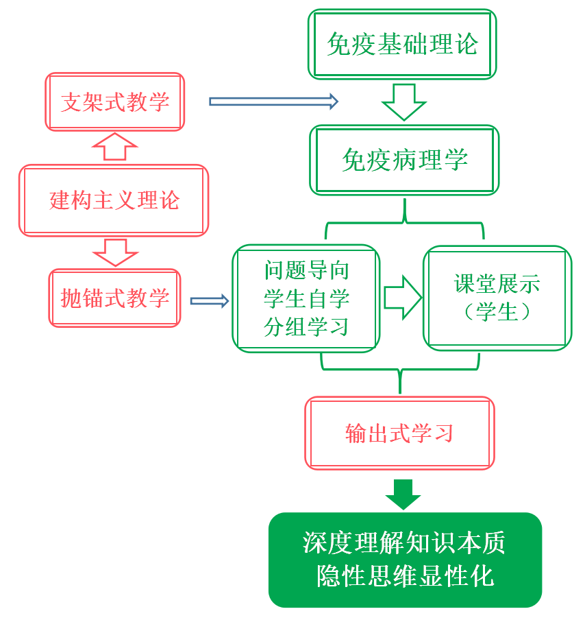 免疫学的主要内容包括基础理论和免疫病理两部分。免疫病理是运用基础理论阐释临床疾病的发病机制并提供防治策略。在掌握了基本理论知识后,学生有能力通过自主学习掌握免疫病理的知识。因此,我们在建构主义理论指导的翻转课堂教学模式的基础上,进一步融合了输出式学习原理,在免疫病理部分的教学过程中,创新性设计了全新的在线翻转课堂教学模式。