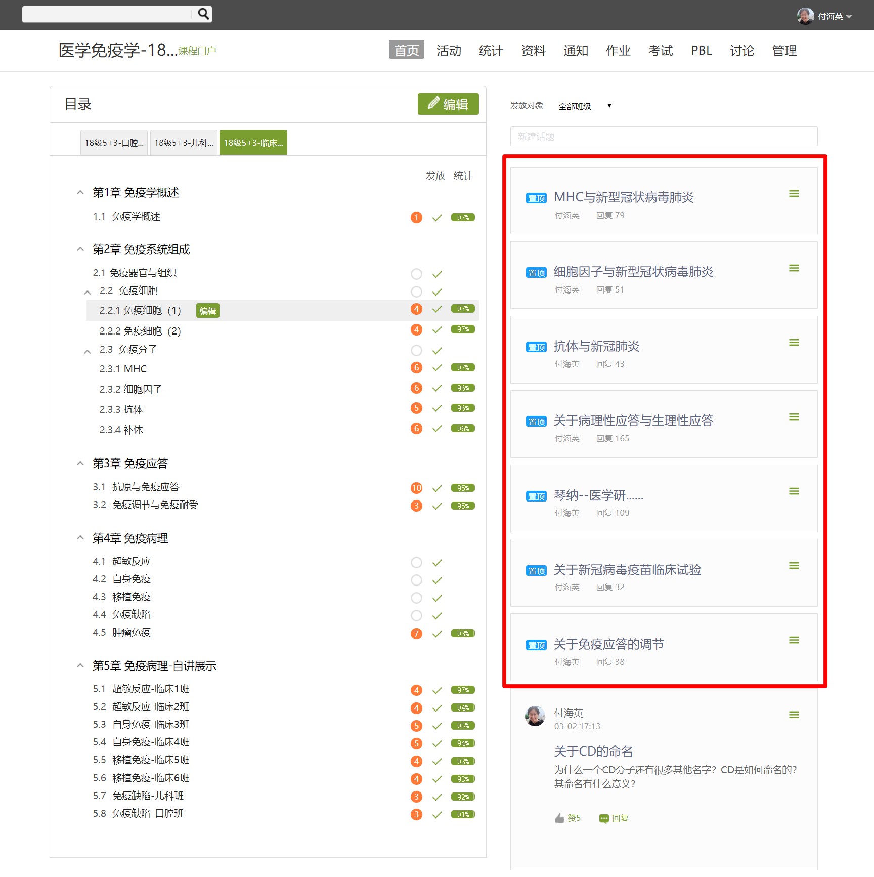 充分利用在线教学优势,开展与授课内容同步的主题讨论,鼓励学生战“疫”中学习免疫学,达到学习免疫学后会战“疫”的教学效果。