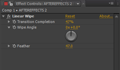 6.找到Liner Wipe(线性擦除)特效,将其拖拽到“Aftereffects2”层,设置Transition Completion(转场完成度)为47,Wipe Angle(擦除角度)为0,Feather(羽化)为47。