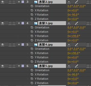 7.选中“水果2~5”素材,按R键打开Rotation(旋转),调整“水果2”的Y Rotation为-90,调整“水果3” 的Y Rotation为90,调整“水果4” 的XRotation为90,调整“水果5” 的XRotation为-90。