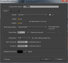 2.执行菜单栏中的Composition(合成),选择New Composition(新建合成)命令,打开Composition Settings(合成设置)对话框,设置CompositionName(合成名称)为“三维魔盒”,width(宽)为“352”,Height(高)为“288”,Frame Rate(帧率)为“25”并设置Duration(持续时间)为3秒。