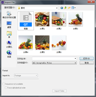 1.双击Proect(项目)窗口,找到素材所在位置,选中所需的素材“水果1~6”、“背景.mov”单击打开。