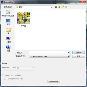 1.双击Proect(项目)窗口,找到素材所在位置,选中所需的素材“方块图.jpg”单击打开。