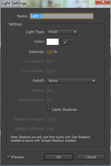 9. 在时间线窗口中单击鼠标右键,选择New(新建)→Light(灯光),修改Light Type(灯光类型)为Point(点光源),Light color(灯光颜色)为淡黄色( R:255;G:255;B:255),Intensity(灯光强度)为120.