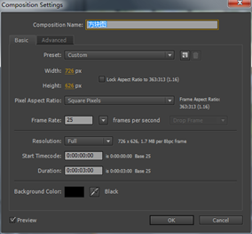 2. 执行菜单栏中的Composition(合成),选择New Composition(新建合成)命令,打开Composition Settings(合成设置)对话框,设置CompositionName(合成名称)为“摄像机动画”,width(宽)为“720”,Height(高)为“576”,Frame Rate(帧率)为“25”并设置Duration(持续时间)为3秒。