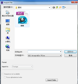 1. 双击Proect(项目)窗口,找到素材所在位置,选中所需的素材“蝴蝶.avi”单击打开。