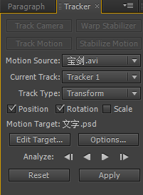 4.在Timeline(时间线)面板中选择“宝剑”层,执行菜单栏中的Animation(动画)→Track Moton(运动跟踪)命令,为“宝剑.avi”层添加运动跟踪。设置Motion Source(跟踪源)为“宝剑.avi”,选中Position(位置)、Rotation(旋转)复选框。