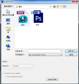 1. 双击Proect(项目)窗口,找到素材所在位置,选中所需的素材“宝剑.avi”“文字.psd”单击打开。