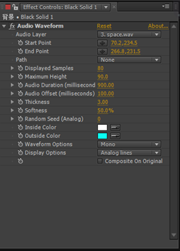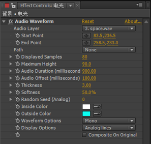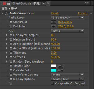 7.选择“电光”层,在Effect Controls(特效)面板|Audio Waveform(波形声音)特效中,设置Displayed Samples(显示样本)的值为80,Maximum Height(最大高度)的值为90,Audio Duration(声音长度)的值为900,Audio Offset(声音偏移)的值为100,Thickness(厚度)的值为3,Softness(柔化)的值为50%,InsideClolor(内部颜色)为白色,Outside Coloe(外部颜色)为青蓝色(R:7;G:252;B:255)。