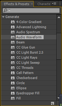 4.在时间线面板中,确认选择“电光”层,在Effects&Presets特效面板中展开Generate(产生)卷展栏,然后将Audio Wavform(波形声音)特效命令拖入到电光固态层。