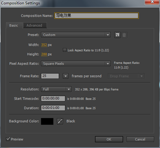 2.执行菜单栏中的Composition(合成)|New Composition(新建合成)命令,打开CompositionSettings(合成设置)对话框,设置Composition Name(合成名称)为“导电效果”,width(宽)为“352”,Height(高)为“288”,Frame Rate(帧率)为“25”并设置Duration(持续时间)为1秒。