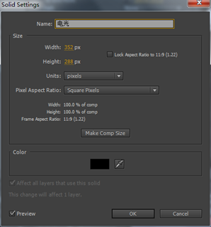 按Ctrl+Y快捷键,此时将打开Solid Settings(固态层设置)对话框,修改Name(名称)为“电光”,设置Color(颜色)为黑色。