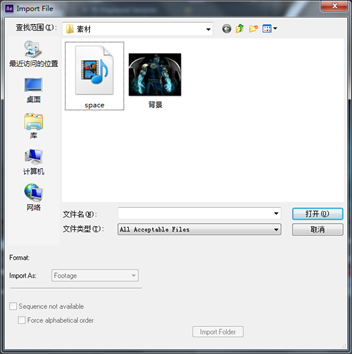 双击Proect(项目)窗口,找到素材所在位置,选中所需的素材“背景.jpg”“space.waw”,单击打开。