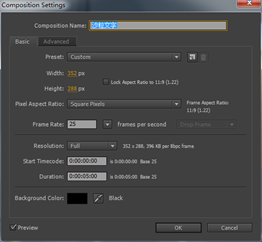 2. 执行菜单栏中的Composition(合成),选择New Composition(新建合成)命令,打开Composition Settings(合成设置)对话框,设置Composition Name(合成名称)为“沙粒文字”,width(宽)为“352”,Height(高)为“288”,Frame Rate(帧率)为“25”并设置Duration(持续时间)为5秒。