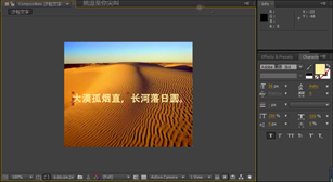 3.单击工具栏中的Horizontal Type Tool (横排文字工具)按钮,在合成窗口中单击并输入文字“大漠孤烟直,长河落日圆”。