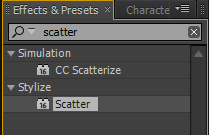 8.在Effects & Presets 特效面板中展开Stylize(风格化)卷展栏,然后将Scatter(分散)特效命令拖拽到文字上。