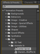 5.在时间线面板中选择文字层,将时调整到0秒的位置,在Effects& Presets特效面板展开Animation Presets(动画预设)→Text(文字)→Animate In(进入动画)卷展栏,然后双击 Center Spiral(中心旋转)特效命令。