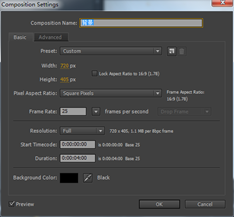 2.执行菜单栏中的Composition(合成)|NewComposition(新建合成)命令,打开Composition Settings(合成设置)对话框,设置Composition Name(合成名称)为“手写字”,width(宽)为“720”,Height(高)为“405”,Frame Rate(帧率)为“25”并预设置Duration(持续时间)为5秒。