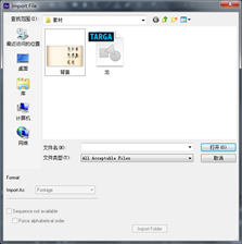 1. 双击Proect(项目)窗口,找到素材所在位置,选中所需的素材“背景.jpg”、“龙.tga”文件,单击打开,导入素材。