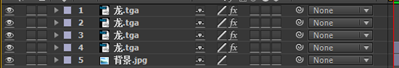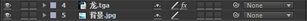 2. 将素材“背景.jpg”、“龙.tga”分别拖入时间线窗口中,调整图层,“背景.jpg”在下、“龙.tga”在上。