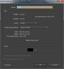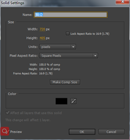 2.按Ctrl+Y快捷键,此时将打开SolidSettings(固态层设置)对话框,设置Name(名称)为“渐变”,设置Color(颜色)为黑色。