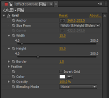 7.在Effect Controls(特效)面板面板中,修改Grid(网格)特效的参数,从Size From(大小来自)右侧的下拉列表中选择Width&Height(宽度与高度滑块)选项,设置Width(宽)的值为15, Height(高)的值为55, Border(边框)的值为1.5.