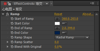 4. Effect Controls(特效)面板中,修改Ramp(渐变)特效的参数,设置Startof Ramp(渐变开始)的值为(360,203),Start Color(开始色)为白色,End of Ramp(渐变结束)的值为(2,399),End Color(结束色)为墨绿色(R:0,G:32,B:75),Ramp Shape(渐变形状)右侧的下拉列表中选择Radial Ramp(径向渐变)。