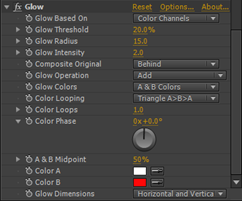 15.在Effect Controls(特效控制)面板中,修改Glow(辉光)特效的参数,Glow Colors(辉光色)下拉列表中选择A&B Colors(A和B颜色)选项,设置Color A(颜色A)为白色,Color B(颜色B)为红色(R:176,G:0,B:0),设置Glow Threshold(辉光阈值)的值为20,Glow Intensity(辉光强度)的值为2,Glow Radius(辉光半径)的值为15。