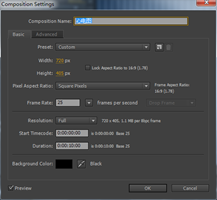 1. 执行菜单栏中的Composition(合成)|NewComposition(新建合成)命令,打开Composition Settings(合成设置)对话框,设置Composition Name(合成名称)为“心电图”,width(宽)为“720”,Height(高)为“405”,Frame Rate(帧率)为“25”并设置Duration(持续时间)为10秒。
