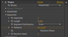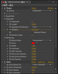 11.在Effect Controls(特效控制)面板中,修改Vegas(勾画)特效的参数,从Stroke(描边)下拉列表中选择Mask/Path(遮罩/路径)选项,展开Mask/Path(遮罩/路径)选项组,从Path(路径)下拉列表中选择Mask 1选项,展开 Segment(分段数)选项组,设置 Segment(分段数)的值为1,Length(长度)的值为0.5,将时间线移到0秒的位置,设置Rotation(旋转)的值为0,单击Rotation(旋转)左侧的码表按钮,在当前位置设置关键帧。