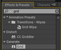 6.为“网格”层添加Grid(网格)特效。在Effects&Presets效果和预制中展开Generate(产生)特效组,将Grid(网格)特效添加到“网格”固态层。