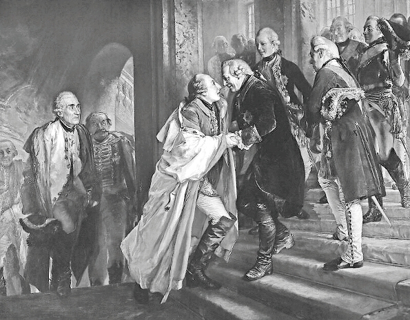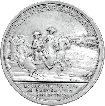 1770年9月30日,腓特烈大帝和约瑟夫二世在摩拉维亚的诺伊施塔特[78]举行第二次会面。与尼斯河的会面相比,两人在诺伊施塔特的会面产生了更加重要的结果。此次会面过程令人非常难忘。和腓特烈大帝约有三十年未见面的考尼茨·里特贝格公爵文策尔·安东与这个老是挫败自己外交手腕的男人[79]热情地握手。腓特烈大帝直率地向考尼茨·里特贝格公爵文策尔·安东谈起这场注定不会有好结果的战争[80]可能引发的种种危险。两人一致认为,俄罗斯帝国的攻击势头已经成为潜在的威胁。因此,在和各自的同盟国依旧保持互助关系的同时,普鲁士王国和奥地利大公国都开始想办法力劝叶卡捷琳娜大帝保持克制。1770年年底,普鲁士王国的亨利亲王[81]奉命前去拜见叶卡捷琳娜大帝。叶卡捷琳娜大帝告诉亨利亲王,她坚决要将俄罗斯帝国对摩尔达维亚公国[82]的占领行动进行到底,至少也要让这个地方完全独立出来。得知这个消息后,腓特烈大帝写信告诉亨利亲王,他既不赞成叶卡捷琳娜大帝的决定,也不会支持俄罗斯帝国的侵略行为,因为他不想像“波吕斐摩斯[83]一样被人唾弃”。在奥地利大公国,玛丽亚·特蕾莎、约瑟夫二世及考尼茨·里特贝格公爵文策尔·安东的想法与腓特烈大帝不谋而合。但实际上,三个人既不信任叶卡捷琳娜大帝,也不信任腓特烈大帝。