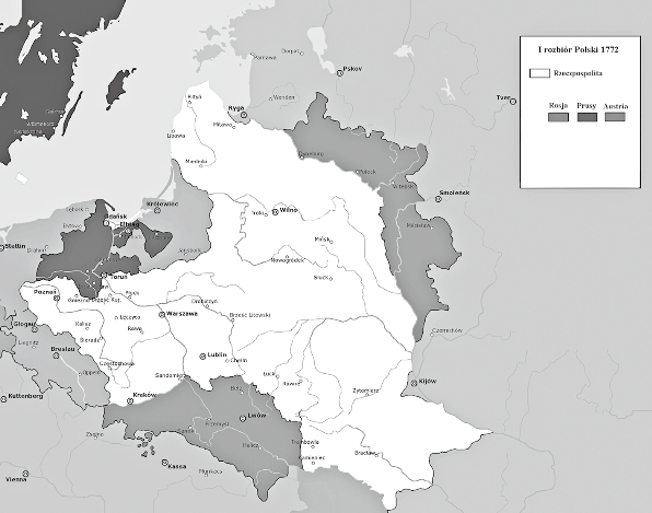 对于腓特烈大帝而言,1771年的情况似乎是这样的:“俄罗斯帝国在奥斯曼帝国占据着一块很大的领土,并对波兰-立陶宛王国构成了威胁。奥地利大公国占有一部分波兰-立陶宛王国的土地,这对俄罗斯帝国更是一种威胁。双方都有求于我,想让我帮他们打击另一方。我眼下虽然处在一个仲裁者的位置,但并没有等量的土地去平衡二者的需求。”为此,腓特烈大帝想到一个巧妙的办法。这个办法带有强烈的个人特色,甚至让人一看就知道是出自腓特烈大帝之手。1771年2月,腓特烈大帝托亨利亲王向叶卡捷琳娜大帝转达他的建议,即由普鲁士王国、奥地利大公国及俄罗斯帝国共同瓜分波兰-立陶宛王国。于是,三个国家达成了公平交易。俄罗斯帝国放弃了对奥斯曼帝国的大肆劫掠。奥地利大公国能从波兰-立陶宛王国攫取更多的利益。腓特烈大帝则满足于他得到的那块小小的区域——西普鲁士[88]。腓特烈大帝的态度很明确。他决不允许奥地利大公国和俄罗斯帝国分别在波兰-立陶宛王国和奥斯曼帝国无节制的扩张。如果奥地利大公国和俄罗斯帝国不按照他的想法行事,那么他就会坚决和这两个国家对抗到底。叶卡捷琳娜大帝并不愿意放弃波兰-立陶宛王国和奥斯曼帝国。但事实摆在眼前,如果她继续一意孤行糟蹋波兰-立陶宛王国人的土地,那么普鲁士王国就一定会向俄罗斯帝国开战。而她要是单枪匹马地去掠夺奥斯曼帝国的财富,俄罗斯帝国就会和奥地利大公国卷入战争。要想同时维护三个国家的利益并达成合作共赢的局面,就不得不牺牲波兰-立陶宛王国。只要牺牲了波兰-立陶宛王国,奥斯曼帝国的领土就不会面临被分割的危险,而普鲁士王国、奥地利大公国及俄罗斯帝国也就能携手走出这个造成三个国家之间种种冲突的迷宫。