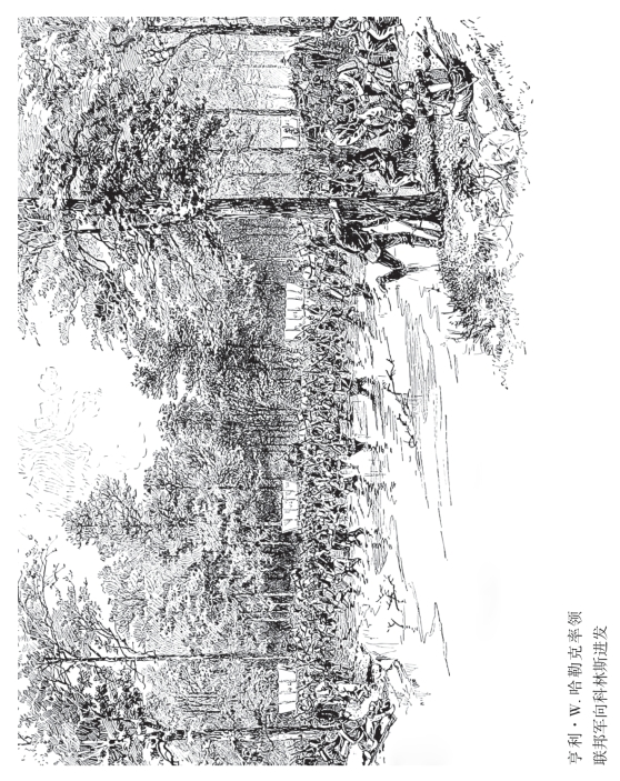 威廉·T.谢尔曼与尤利西斯·S.格兰特谈话后,北方联邦军占领了科林斯。亨利·W.哈勒克率十万大军向科林斯进发,每次修整时都命人挖壕沟防守。因此,威廉·T.谢尔曼称此次行军为“掘击”[87]。亨利·W.哈勒克逼退了科林斯的驻军,占领了这一战略要地。但亨利·W.哈勒克如果能重创皮埃尔·博勒加德的军队,一定会取得更大成就[88]