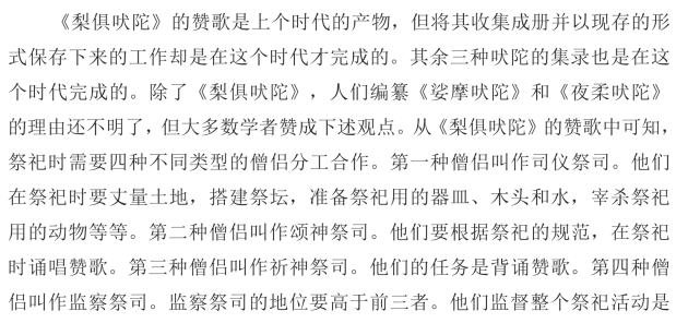 否合乎祭祀规范。这四种僧侣中,第四种僧侣熟知祭祀的各个方面,第三种僧侣只要知道《梨俱吠陀》的内容就可以了,所以这两种僧侣都不需要特别的指导书籍。与之相反,其余两种僧侣就需要特别的技术指导。而《夜柔吠陀》就是为第一种僧侣编写的关于祭祀仪式的书;《娑摩吠陀》就是为第二种僧侣编写的关于歌唱赞歌的书。通过《梨俱吠陀》中已经出现“娑摩”和“夜柔”的名称来看,毫无疑问,当时的人们很早就已经对赞歌和仪式有了研究。而《娑摩吠陀》和《夜柔吠陀》的编纂工作都是在这个时代才完成的。