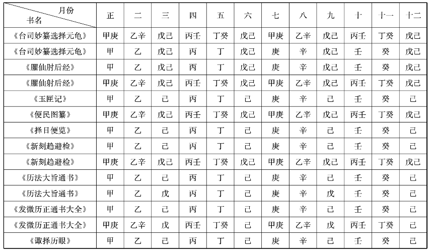 据《钦定协纪辨方书》的记载,约在11世纪左右由掌禹锡编写的《地理新书》中,复日的安排开始出现新的变革:“正月,甲;七月,庚;二月,乙;八月,辛;四月,丙;十月,壬;五月,丁;十一月,癸;三月、九月,戊;六月、十二月,己”[48],其铺注方式较先前的分划更加细致。然而,此一新的复日规则,似乎一时并未能获官方天文学家接受,如在《大宋宝祜四年丙辰岁会天万年具注历》抄本中,所有复日即仍依循《历例》的法则,唯某些原应出现复日的日子,却不见铺注,此或因该日另出现其他极凶的神煞而遭略去。[49]