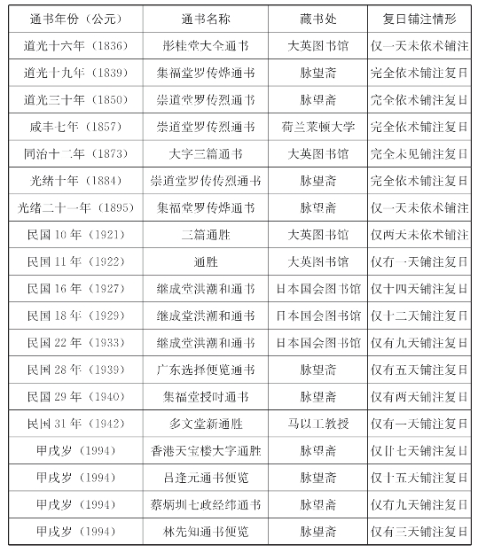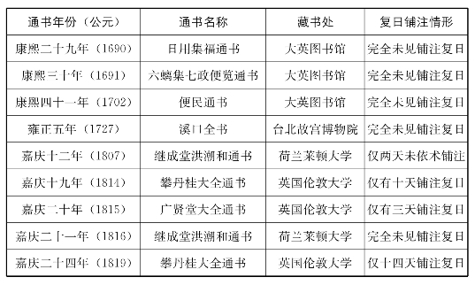 表八 笔者过眼年度通书中的复日铺注情形