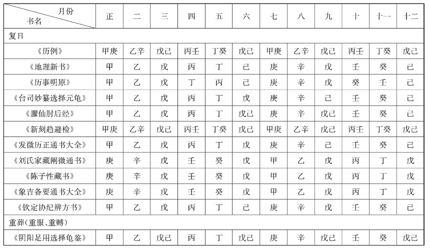 《天宝历》曰:“复日者,为魁、罡所击之辰也,故曰复其日,忌为凶事,利为吉事。”《历例》事【曰】:“正、七月,甲、庚;二、八月,乙、辛;四、十月,壬、丙;五、十一月,丁、癸;六、十二月,戊、己也。”震圭谓:“复日者,重见也。为遇本建之辰,有所忌之干同也。假令正月建寅,即甲也,又如辰、戌月,戊也,丑、未者,己也,仿此。”又按:“《地理新书》云:正月,甲;七月,庚;二月,乙;八月,辛;四月,丁;十月,癸;五月;丙;十一月,壬也。”[69]