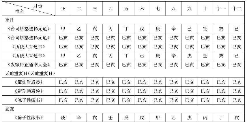 在约13世纪成书的《台司妙纂选择元龟》中,我们也可发现除了复日之外,另出现有性质相近的重日和重葬两神煞,其中重日早见于汉简,其铺注规则是系于每月的巳、亥两日[54]。或因重、复二字均有“吉者愈吉、凶者愈凶”的寓意,故前引书称复日“宜一切吉事,不宜凶兆”,而若在重丧日殡葬,亦被认为可能再发生丧事。唯经查该书不同章节中所记各神煞的铺注规则,却发现同一神煞往往前后有差[55],此一情形亦同样见于表六中的《台司妙纂选择元龟》《臞仙肘后经》《新刻趋避检》《历法大旨通书》《发微历正通书大全》《永宁通书》等书。