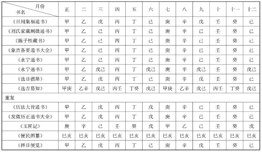 在12、13世纪间编撰的《三历撮要》中,我们还可见到复日名称的突变[52],如该书正月安葬吉日条下即称:“癸酉、丁酉、己酉三日,不犯重复、重赙诸凶杀,大利”,虽然此书并未明记这些神煞的宜忌和铺注规则,但从稍后的选择书中,知重赙即重葬(亦与复日相关,详见后)之别名[53],而《三历撮要》十月安葬吉日条下,记当月丙午和壬午两日均“值重复”,又恰与《历例》中铺注复日的法则相合,疑此“重复”或源自先前所述的复日。