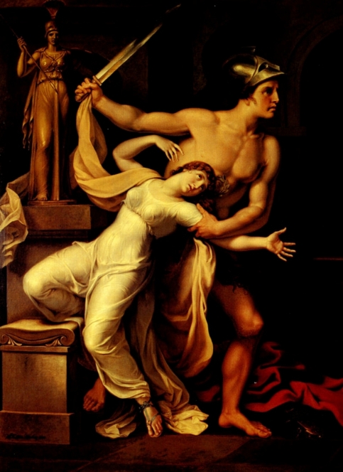 希腊士兵将国王普里阿摩斯的小女儿卡桑德拉从她藏身的神殿里拽了出来,约翰·海因里希·威廉·蒂施拜因(Johann Heinrich Wilhelm Tischbein,1751——1829)绘