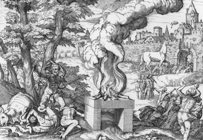 其实,佯装弃城、乘船离开的希腊人只是去了忒涅多斯岛,那里离海岸只有1里格[1]。白天他们隐藏在忒涅多斯岛,当夜幕降临的时候,他们立刻将船掉头驶回陆地,秘密地下了船,然后在夜色的掩护下来到了特洛伊城门口。与此同时,为了欺骗所听令的特洛伊将领而假寐的西农悄悄地下了床,蹑手蹑脚地穿过街道来到放置木马的地方。然后,他打开了藏在木马侧面的一处小门。只见门里竟然钻出一队全副武装的士兵。这些士兵立刻整理好装备冲向城墙,杀死了惊呆的哨兵和巡夜者,然后打开了城门。埋伏在城门外的希腊主力部队趁着寂静的夜色,畅通无阻地进了特洛伊城。