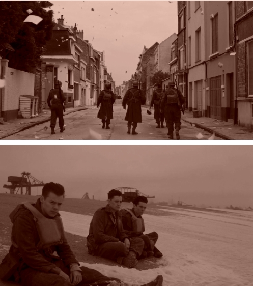 布光问题常常是普通观众意识不到的。诺兰拒绝在摄影棚里搭建船舱内部的场景,他要了一些真实的船只,摄制组只能在真实船只的内舱中进行重新布光,以适应电影拍摄的照明要求。这些布光工作都要在摄影师的指导下进行。为了选择灯具,霍特玛也是颇费了一番周章,他从不同地方采购、订制了各种特殊的灯具,甚至还要对船只进行电力、电路改造。你还记得影片开始不久,那个挤满了士兵的驱逐舰内舱吗?场景中那黄黄的色调正是通过灯具发出来的,它准确地呈现了一种幽闭的压迫感,又传递出年代感。