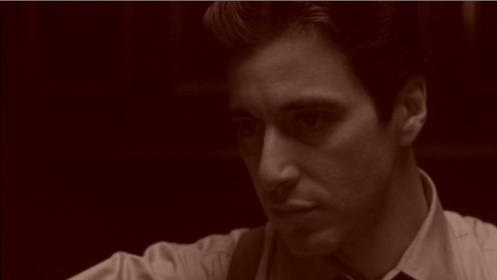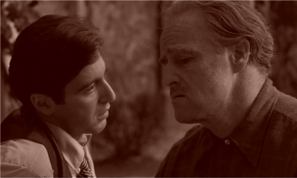 说起《教父》,我又想起阿尔·帕西诺曾经几次谈到在表演上马龙·白兰度对他的意义。他说每回当他注视马龙·白兰度的时候,都会意识到自己正在观察一位伟大的演员,无论他是不是在表演。帕西诺清楚地记得第一次观看《码头风云》时,当影片结束,自己呆立在那里无法离开电影院,他想有必要再看一遍。帕西诺喜欢回味他和马龙·白兰度第一次见面的情景,当时他和戴安·基顿,就是在《教父》中演他妻子的那位女演员坐在一起,他们坐在桌子的一边,另一边坐着的就是白兰度。他们都尽力想把他当作一名普通的演员,但还是非常紧张,马龙·白兰度向两人问好,基顿回答说“我很好”,语气就好像她不敢相信眼前发生的事情。果然她终于憋不住了,她对帕西诺悄悄说:“我不敢相信这是真的!” 基顿是个很放得开的女演员,能够说出自己的真实感受,而帕西诺坐在一边从头到尾都紧张得不行。有一次马龙·白兰度来到现场看帕西诺演戏,那次正在拍《教父》中他和基顿的第一场戏。马龙·白兰度没有通告,但他来到了排练场,径直走到了摄影机边上,开始观看他们演戏。在拍摄过程中有一片树叶落在了帕西诺的肩上,他拿下扔掉了。过了一会儿,马龙·白兰度走了过来,对他说:“我很喜欢那片树叶落在你肩上时,你做的那个动作”。很显然出演《教父》使帕西诺得以近距离观看马龙·白兰度那著名的方法派表演。白兰度敢于将自己的缺点演绎成人物的特点,这一招真正启蒙了帕西诺的表演观念。别的不说,他自此不再为自己的烟嗓而烦恼了,反而强化了这个缺点,将它当作塑造人物的法宝。