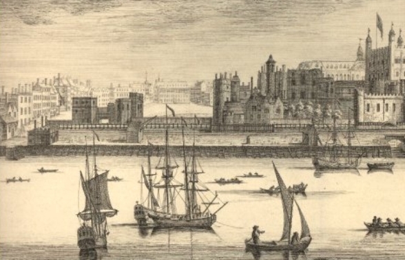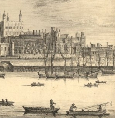 伦敦塔位于泰晤士河畔,始建于征服者威廉时期,是英国伦敦一座标志性建筑,曾作为堡垒、军械库、国库、铸币厂、宫殿、天文台、避难所和监狱,特别关押上层阶级的囚犯。图为一幅雕版画,泰晤士河畔的伦敦塔,塞缪尔·巴克(1696—1779)绘于1737年